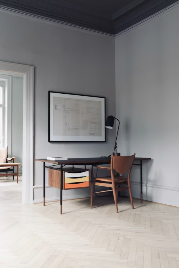 A pared-down walnut frame and leather-clad seat and back make the 46 Dining Chair comfortably lightweight. Beautiful from all angles, Danish designer Finn Juhl’s enduring piece is ideal for a dining or workspace. Made in Denmark.