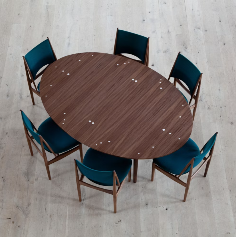 Legendary Danish designer Finn Juhl’s Silver Dining Table (1948) features a tabletop finished with 30 sterling silver inlays (42 when fully extended) that inspired its nickname, the Judas Table. Ideal for use as a dining or conference table, it can be extended with two eaves while its frame stays in place. It comfortably seats four to 14 guests. Made in Denmark.