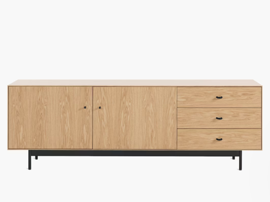 Lightness meets durability in the distinctive Loop Media Unit (2024), a DWR exclusive. Rotterdam-based designer Rachel Griffin achieved the airy look with slight proportions, “stepped back” edging and a slim metal base. Two doors and three sizable drawers tackle storage, while cable holes at the back of each shelf and the bottom keep wires tidy. A sleek addition to any contemporary space, Loop’s fully finished back allows for easy placement wherever storage is needed. Made in Estonia.