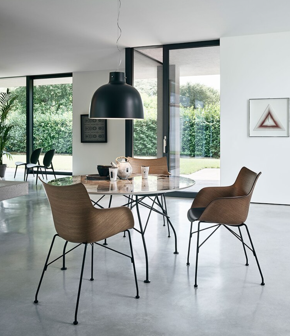 Designed by Ferruccio Laviani for Kartell, the Bellisima Mat Pendant (2018) casts light downward, making it ideal for dining and workspaces. Its tactile finish and exposed wiring playfully nod to factory pendant lights. Bulb (included): E26 7.5 LED. Made in Italy.