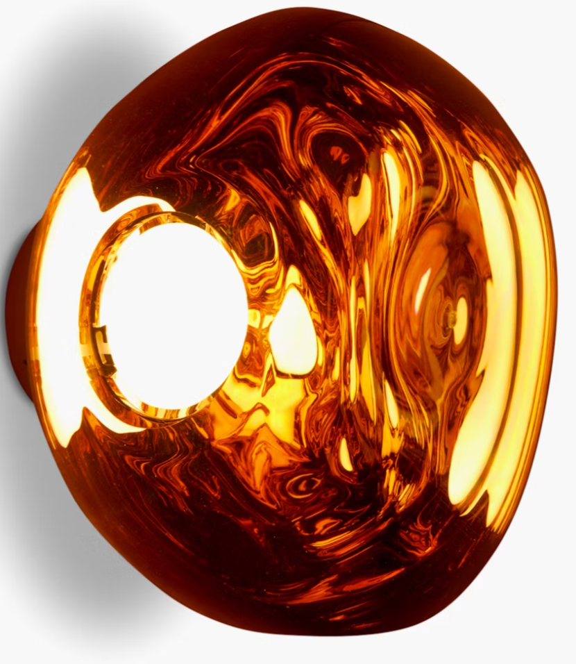 Tom Dixon’s Melt Mini Surface LED Light (2018) is a true conversation piece. Its distinctive melted form results from a blow molding and vacuum metallization process, which creates a mesmerizing glow when on and a mirror-finish effect when turned off. Made in Germany.