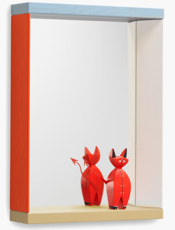 Swiss-French designer Julie Richoz’s Colour Frame Mirror for Vitra (2024) has the graphic appeal of children’s wood toys. Available in three sizes and color combinations, this cheery mirror has a sizable shelf for storing small household items. Arrange several mirrors together — like building blocks — to create unique compositions. Made in Germany.